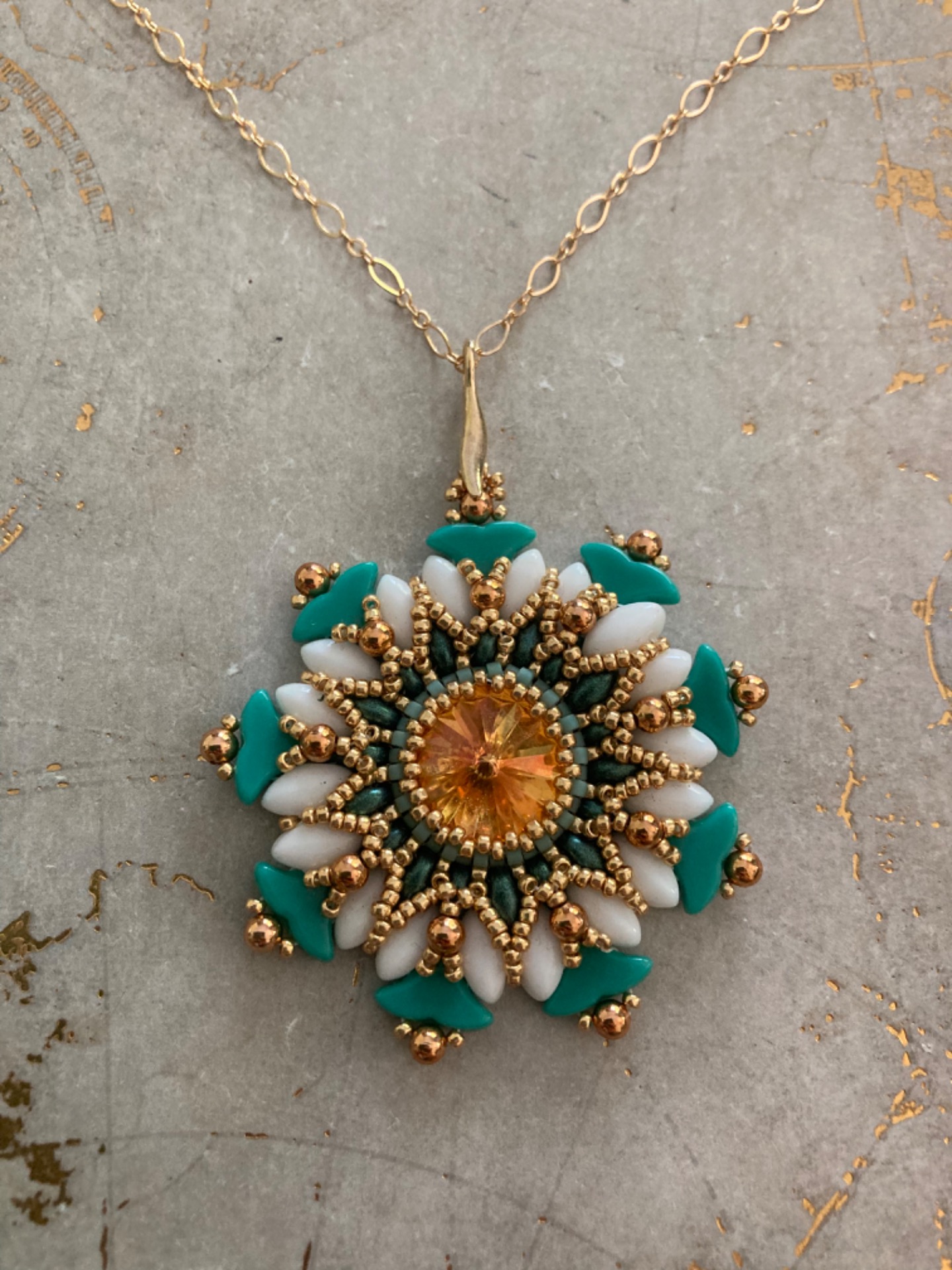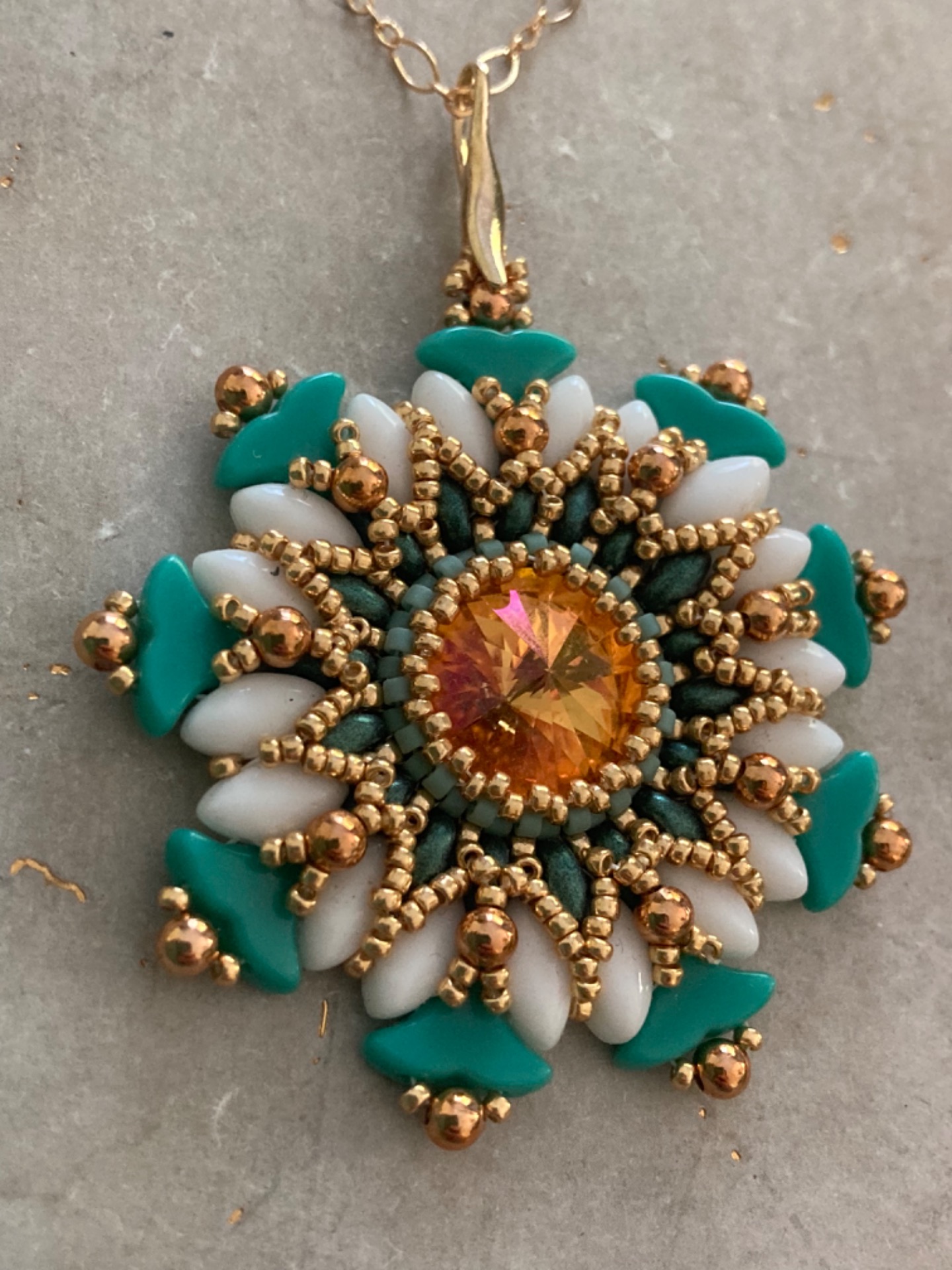 Hanger vervaardigd met Franse en Tjechische kralen. Afgewerkt met Pure Crystal.