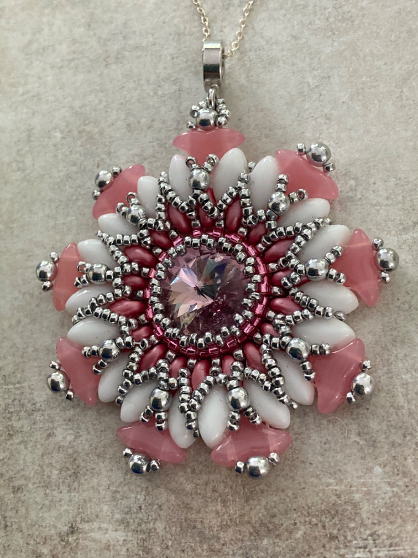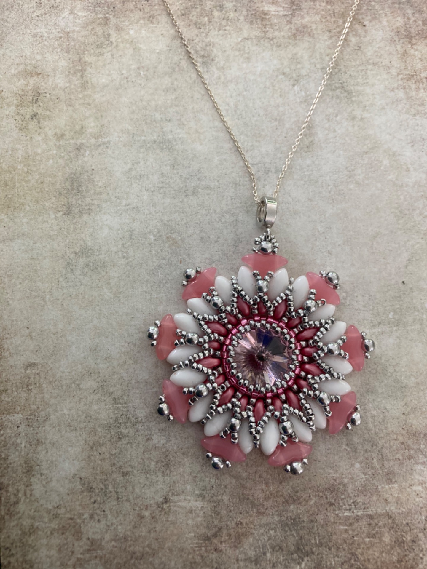 Hanger vervaardigd met Franse en Tjechische kralen. Afgewerkt met Pure Crystal.