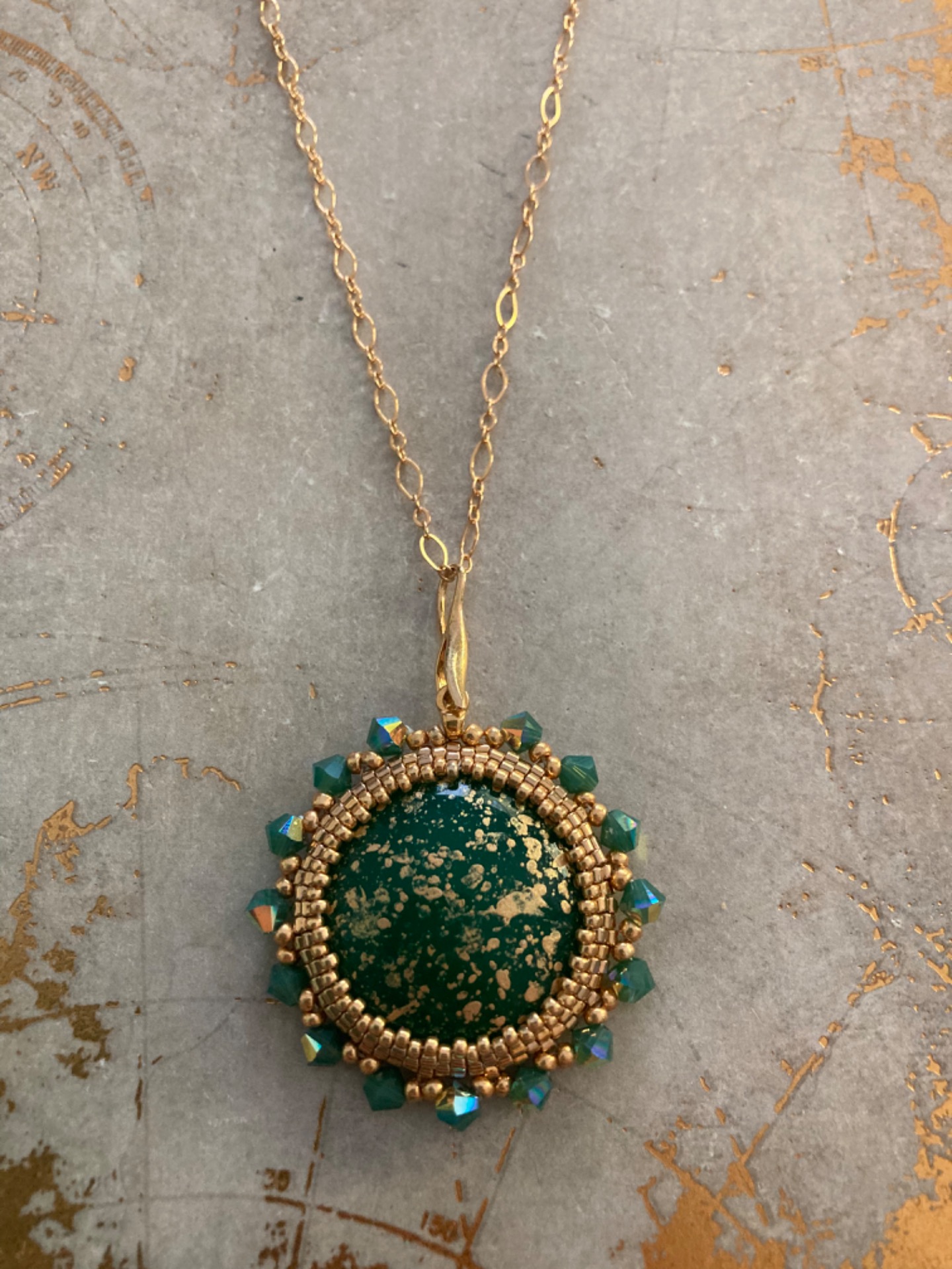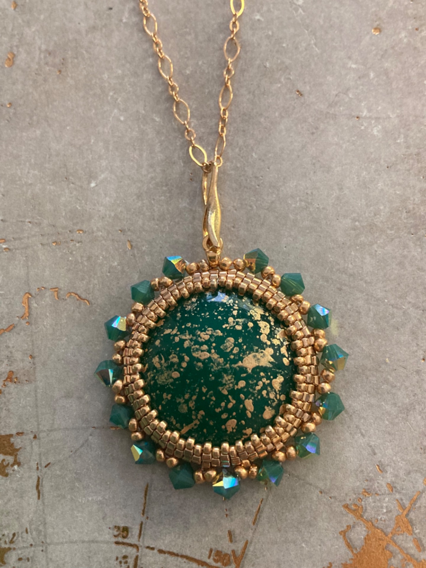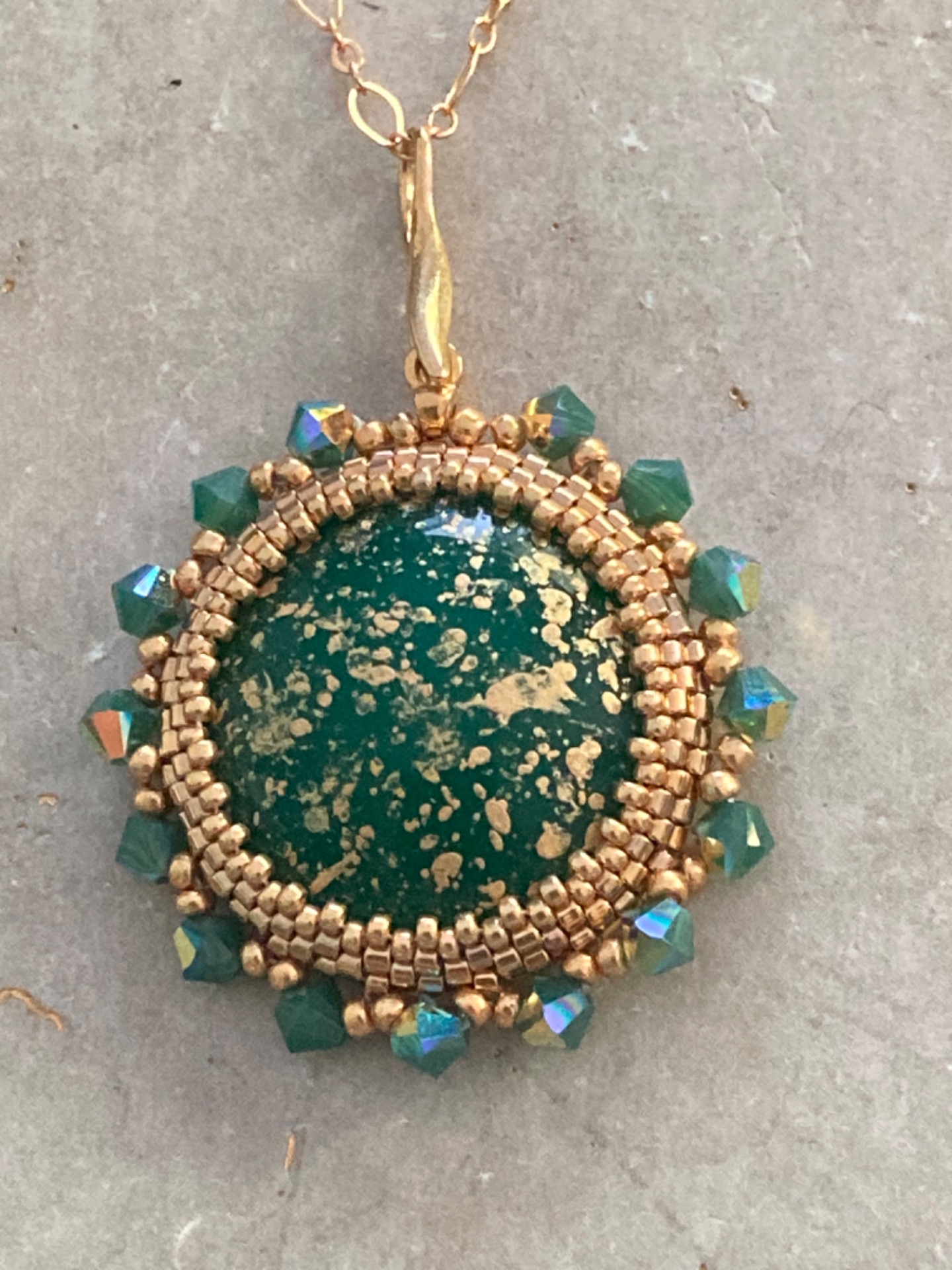 Grootte hanger: 3,5 cm diameter met Cabochon van 2,5 cm. Swarovski toupies van 4 mm.