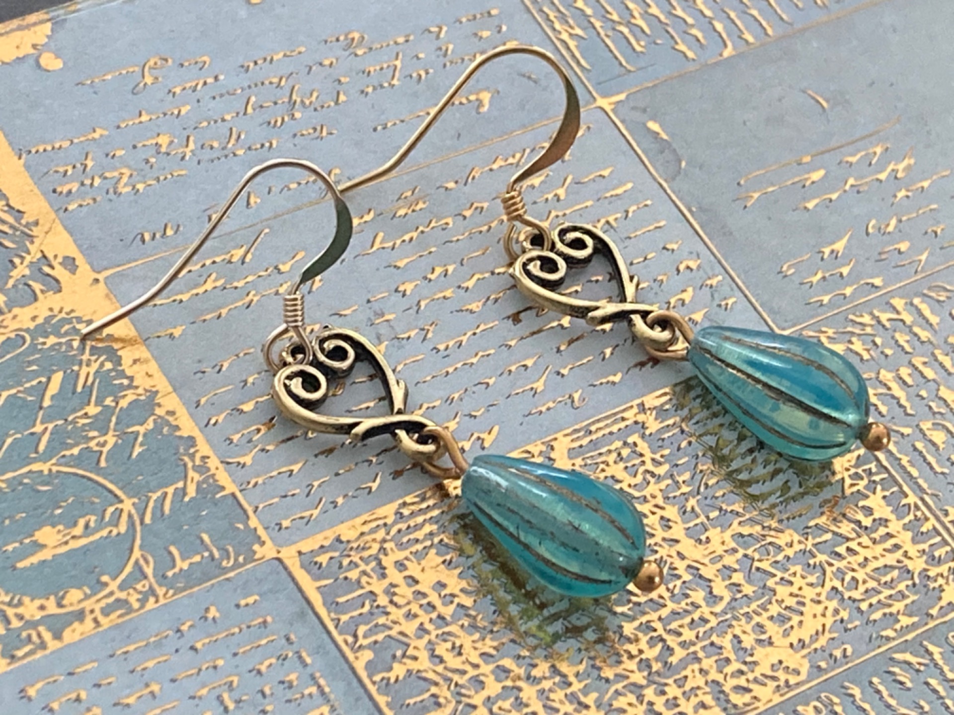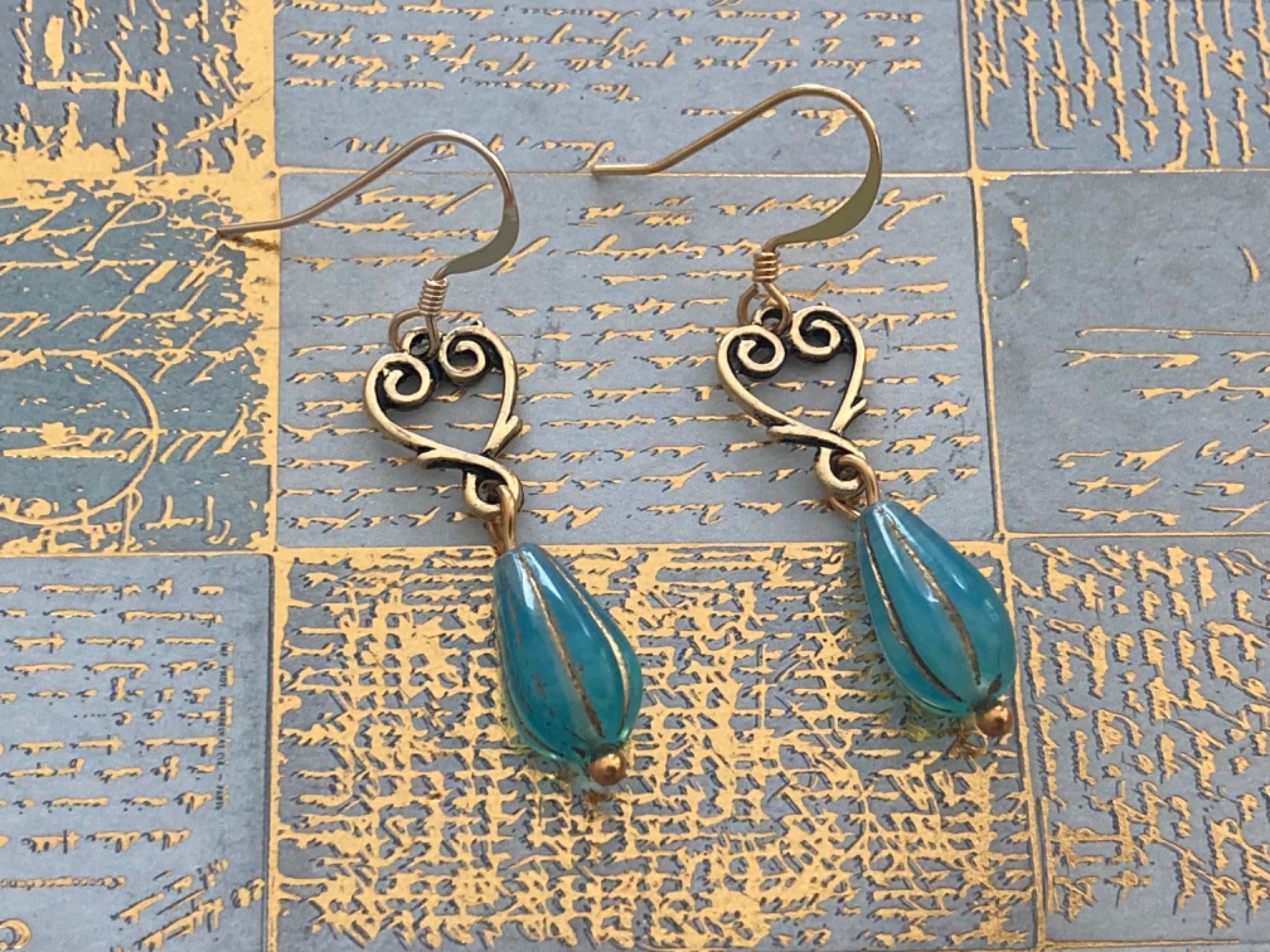 Gold filled (14k) oorbellen met glazige traandruppel.Afgewerkt in romantische stijl met hartvorm.