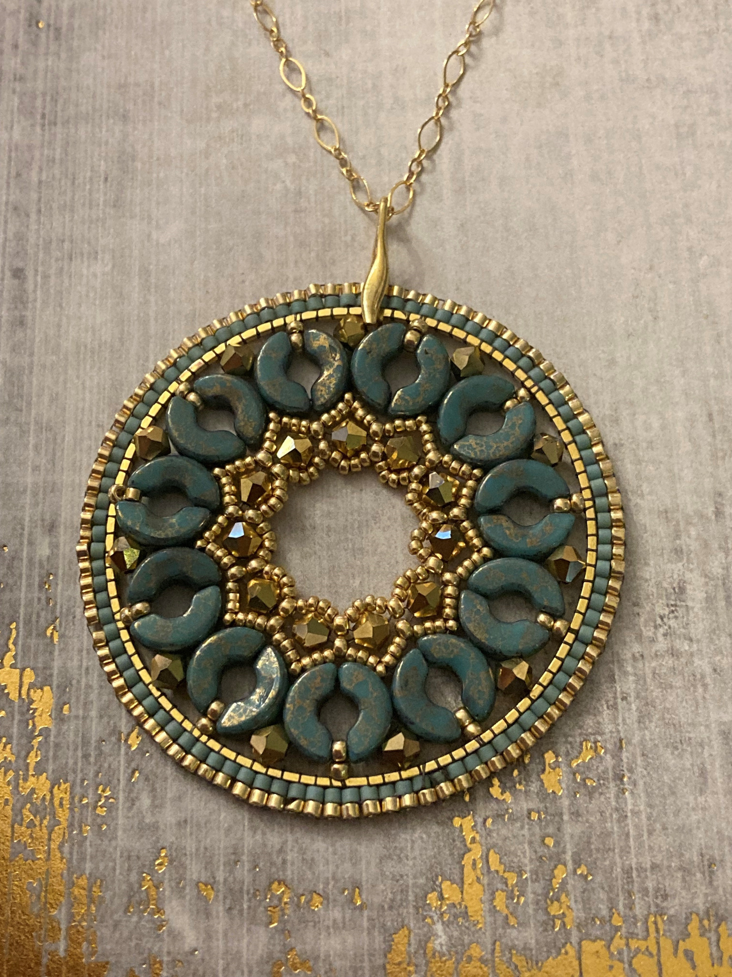 Diameter 5 cm, Franse Perles par Puca en Swarovski toupies 4 mm.